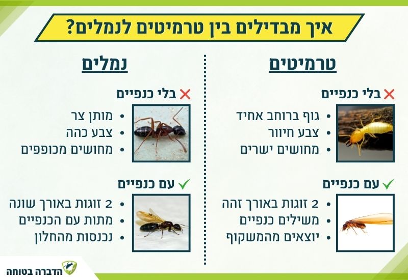 ההבדל בין טרמיטים לנמלים – טבלת השוואה לזיהוי מהיר